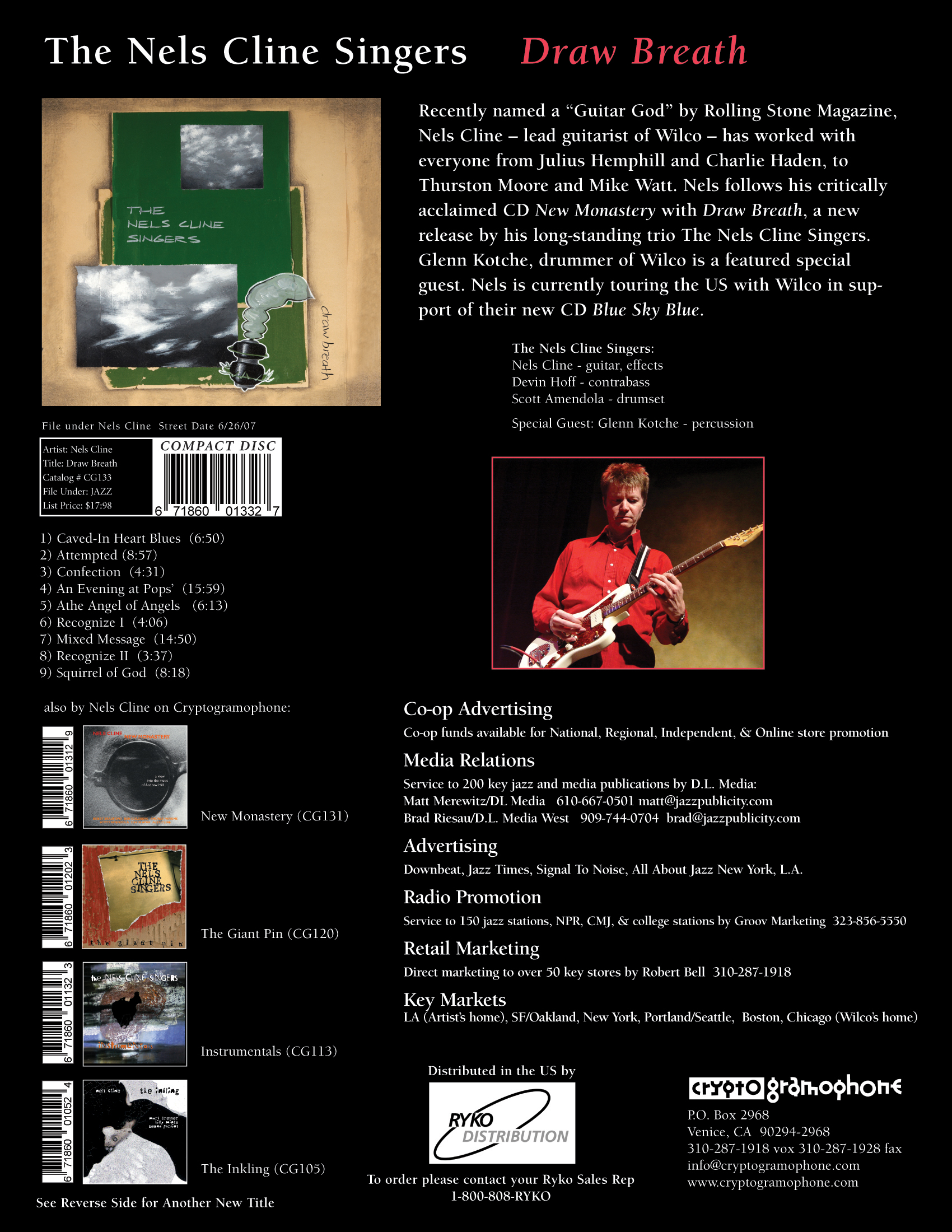 has worked with everyone from Julius Hemphill and Charlie Haden, to Thurston Moore and Mike Watt. Nels follows his critically acclaimed CD New Monastery with Draw Breath, a new release by his long-standing trio The Nels Cline Singers. Glenn Kotche, drummer of Wilco is a featured special guest. Nels is currently touring the US with Wilco in support of their new CD.