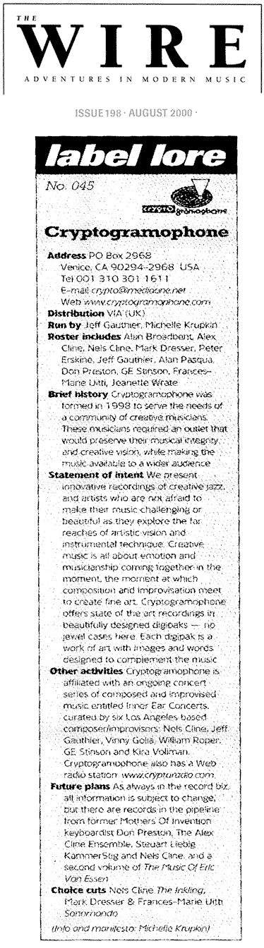 Cryptogramophone Label Profile - The Wire (August, '00) |